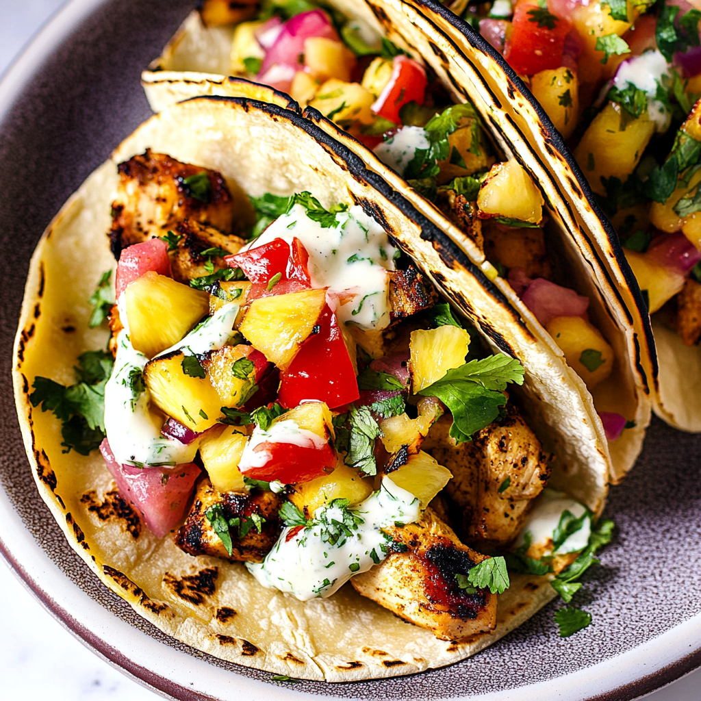 5. Assemble tacos by layering chicken, grilled pineapple salsa, and avocado crema on each tortilla.