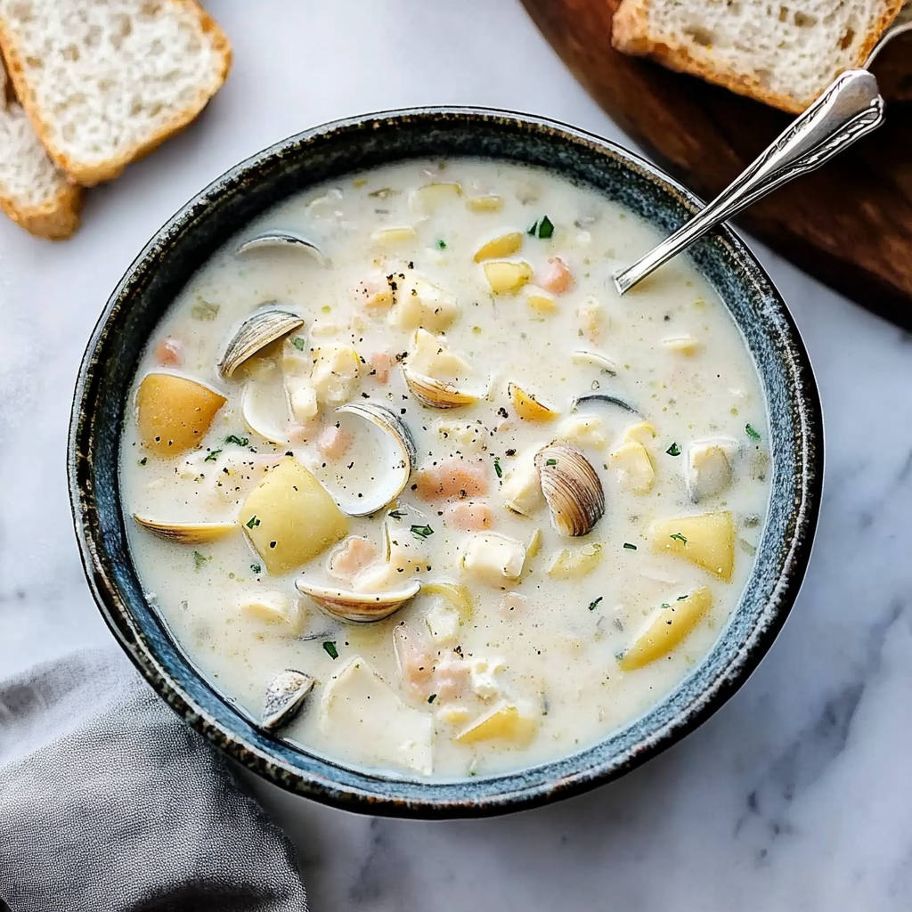 Discover the ultimate comfort food with this creamy Clam Chowder Recipe. This delightful dish combines tender clams, hearty potatoes, and a hint of apple juice to create a unique twist on the classic New England chowder. Perfect for cozy dinners or entertaining guests, this chowder is both satisfying and flavorful. The rich, creamy base is achieved with half-and-half, making each spoonful a luxurious experience. Easy to prepare and adaptable for various occasions, this clam chowder will impress everyone at your table.