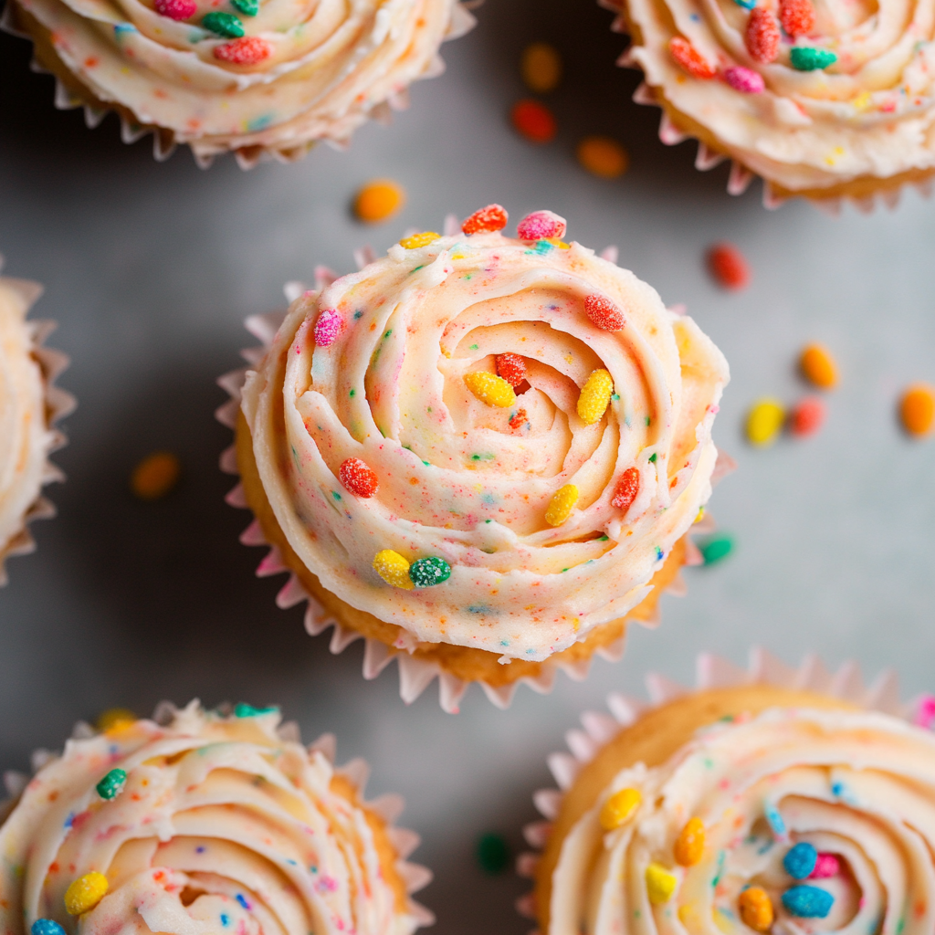 Fruity Pebbles Frosting is a colorful, sweet icing made from a base of ermine frosting infused with Fruity Pebbles cereal, giving it a unique flavor.