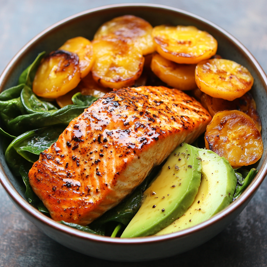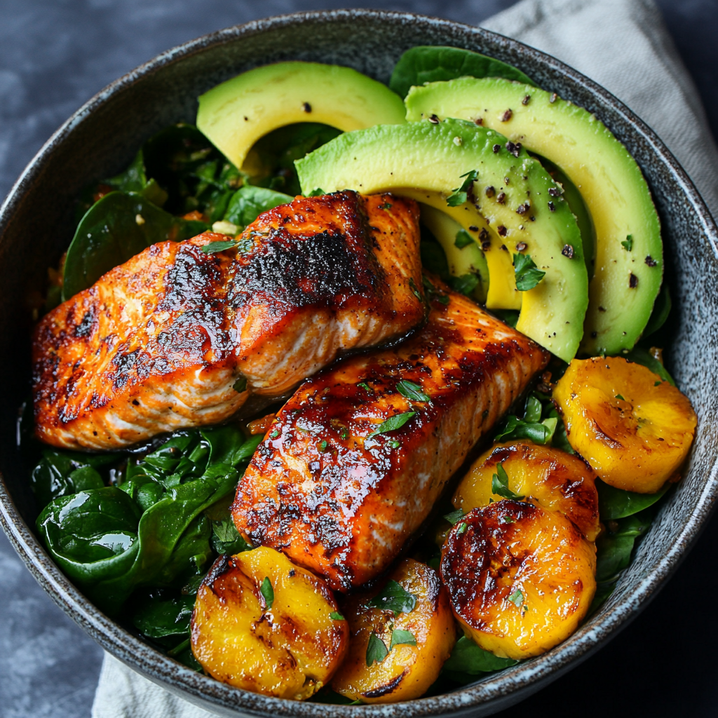 Indulge in a delightful culinary experience with our Glazed Salmon with Plantains, Spinach & Avocado Bliss Bowl. This vibrant dish combines the sweet richness of caramelized plantains, tender pan-seared salmon, and fresh sautéed spinach, topped with creamy avocado slices. Whether you’re looking for a quick weeknight dinner or an impressive meal for guests, this bowl is both nutritious and bursting with flavor. With healthy fats from the avocado and protein from the salmon, it’s a balanced meal that brings a taste of the Caribbean right to your table. Enjoy it warm or as a refreshing cold meal prep option.