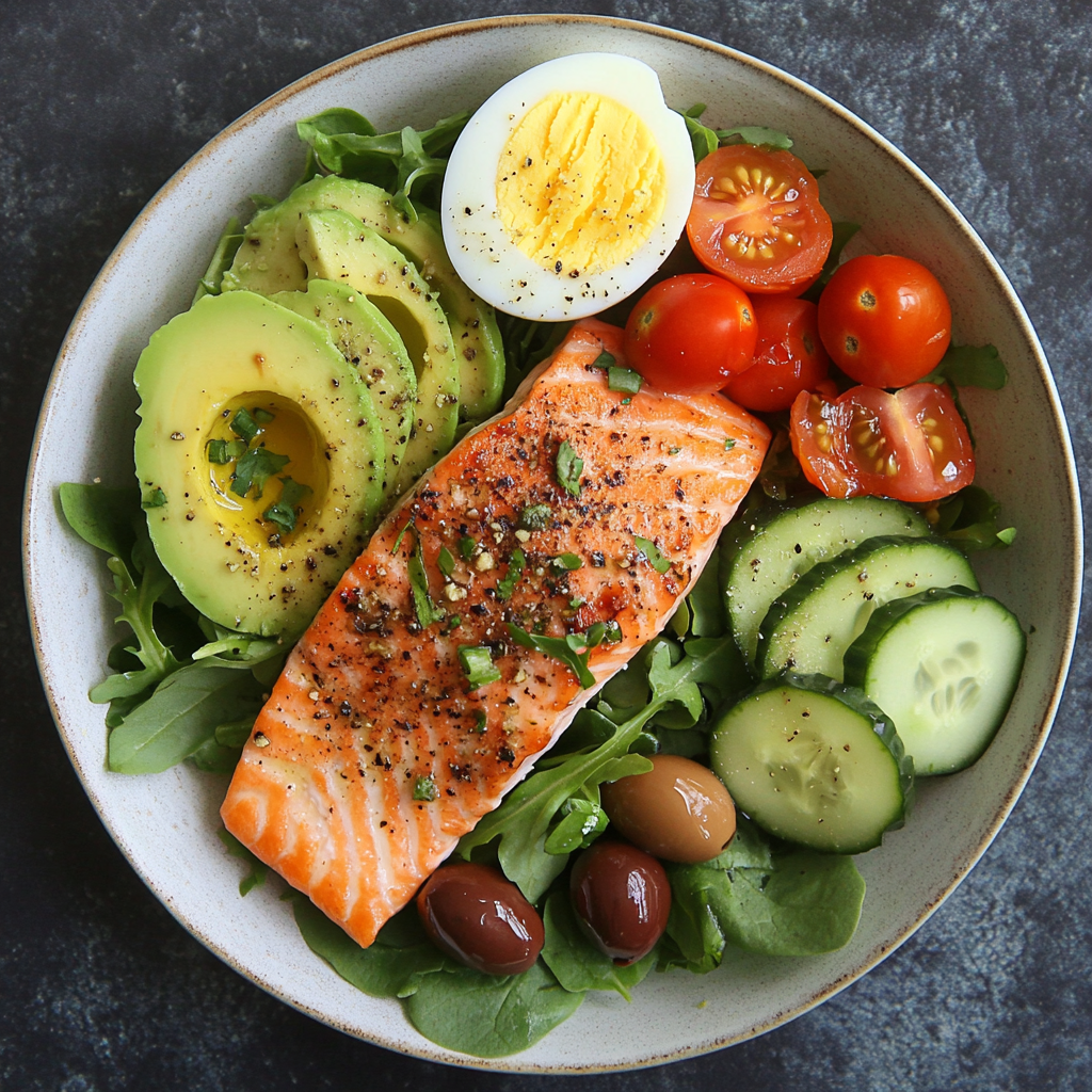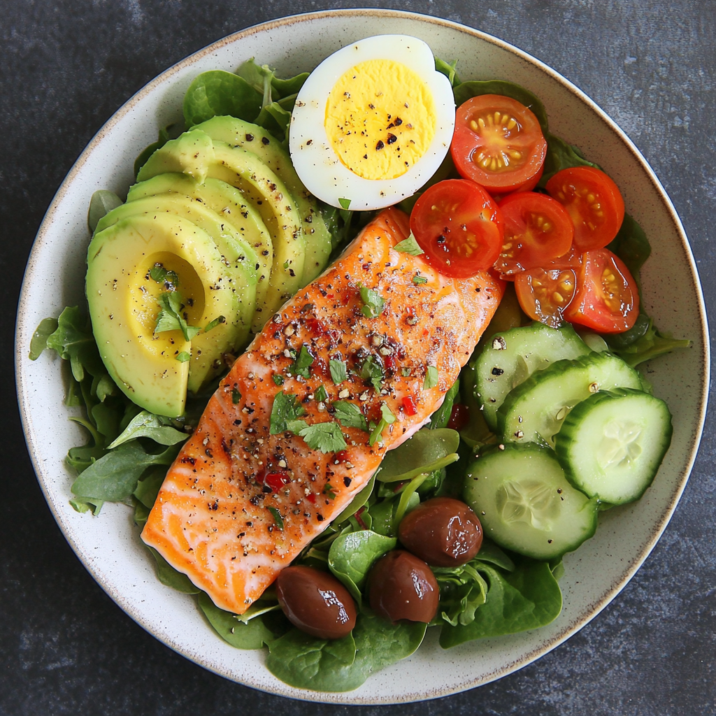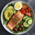 On a large serving plate, create a bed of greens such as baby spinach or arugula. Top with cooked salmon, sliced boiled egg, creamy avocado, sliced cucumber, halved cherry tomatoes, and Kalamata olives.