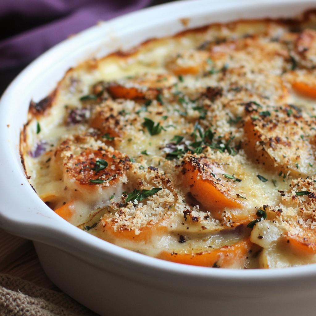 Root Vegetable Au Gratin is a creamy, cheesy dish made with layered root vegetables like potatoes, sweet potatoes, and beets, baked until golden.