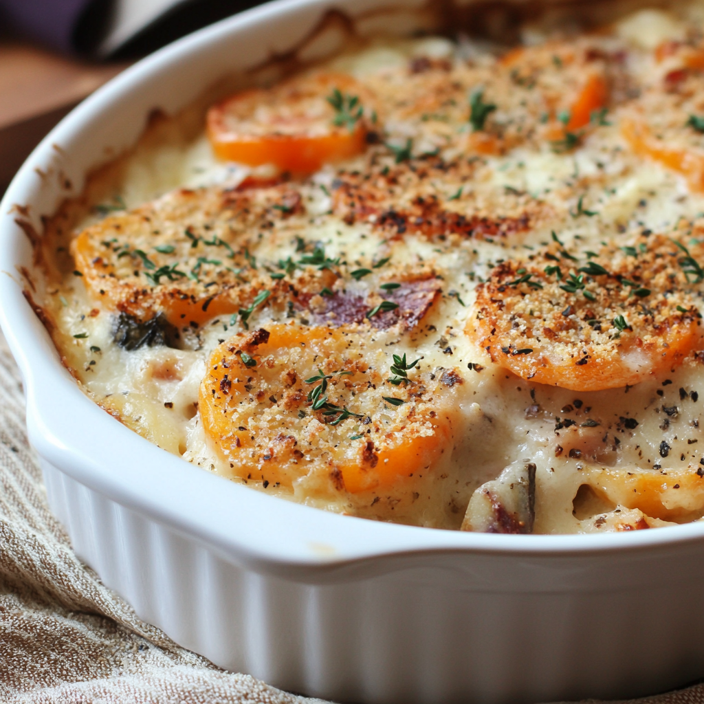 Indulge in the comforting flavors of Root Vegetable Au Gratin, a delightful variation on the classic dish that combines Yukon gold potatoes, sweet potatoes, and beets into a creamy, cheesy masterpiece. This dish is perfect for family gatherings or festive occasions, offering vibrant colors and an irresistible blend of textures and tastes that will impress your guests. The rich cheese sauce, accented with a touch of dijon mustard, elevates the natural sweetness of the vegetables, providing a satisfying side that complements any meal.