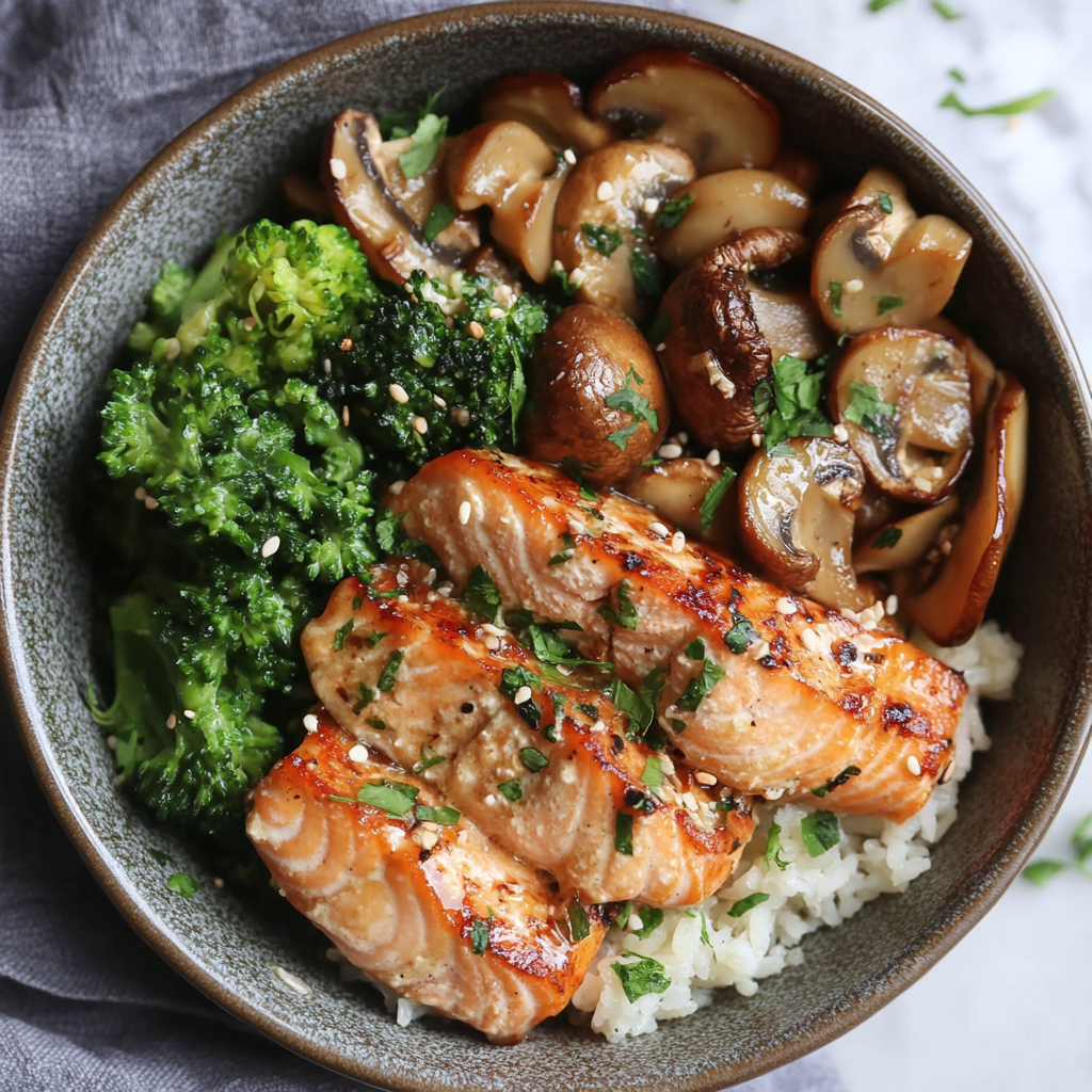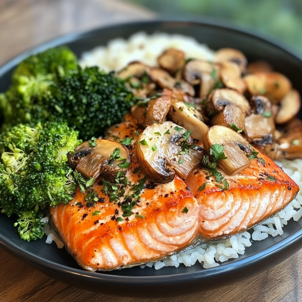 Indulge in the vibrant flavors of the Salmon & Mushroom Power Plate, a nutrient-dense meal perfect for any occasion. This dish combines flaky salmon, earthy sautéed mushrooms, creamy avocado, and fresh arugula to create a balanced plate that not only satisfies your hunger but also nourishes your body. With its quick preparation time of just 25 minutes, you can enjoy a gourmet experience at home without spending hours in the kitchen. The explosion of flavors from perfectly seasoned ingredients guarantees an unforgettable dining experience that’s as pleasing to the eye as it is to the palate.
