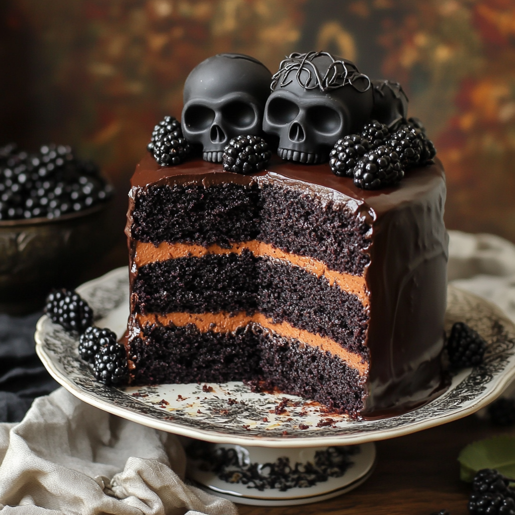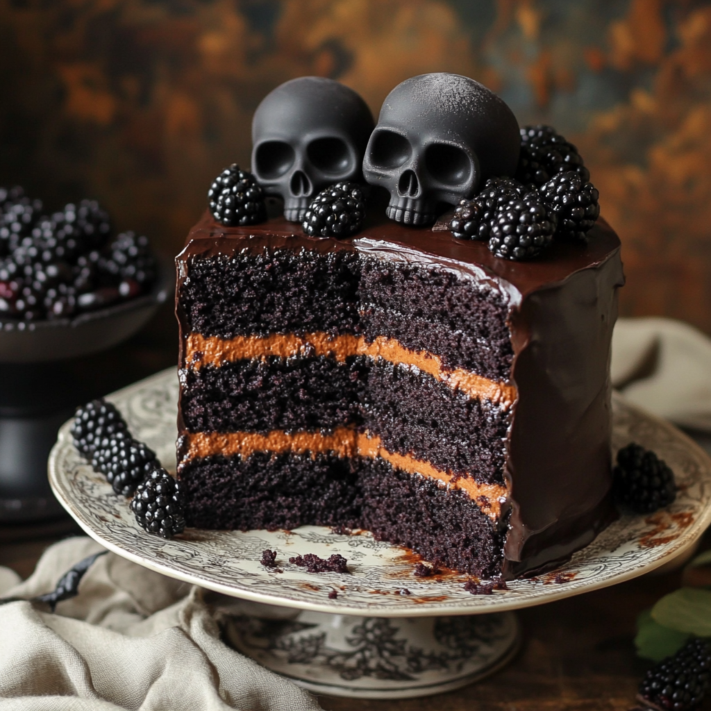 - Eye-Catching Presentation: The dark hues topped with fresh blackberries and chocolate skulls make for a stunning centerpiece.