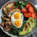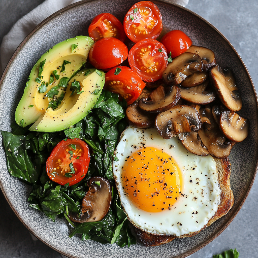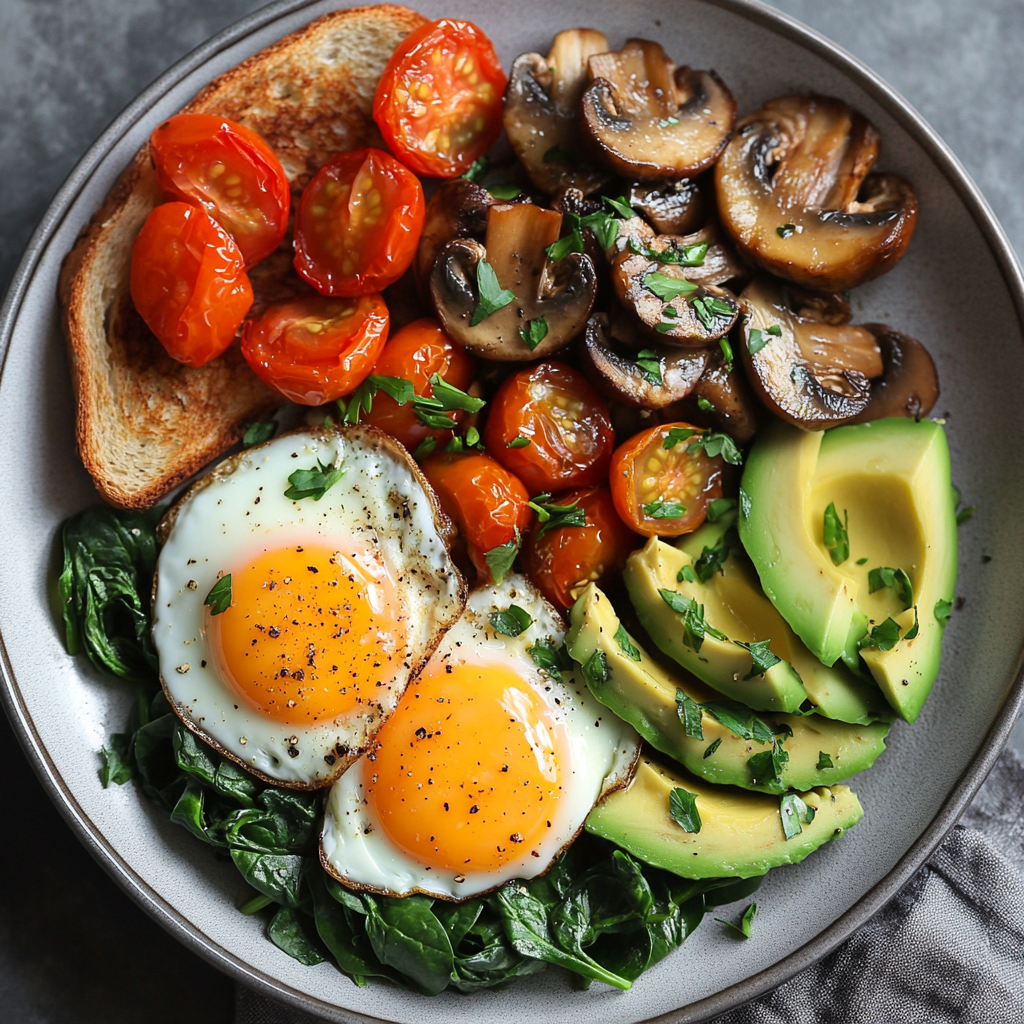 - Assemble on a plate: arrange sunny eggs, sautéed spinach, roasted tomatoes, avocado slices, and mushroom toast. Garnish with chopped parsley before serving.